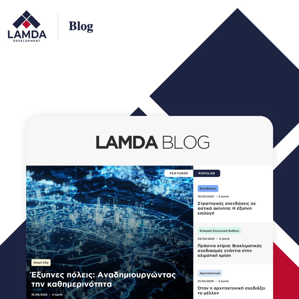Το LAMDA BLOG είναι η νέα digital publishing ενότητα της LAMDA Development, σχεδιασμένη για να ανοίξει το εταιρικό website προς το ευρύ κοινό. Μέσα από κατανοητά και ουσιαστικά άρθρα για βιωσιμότητα, αρχιτεκτονική, επενδύσεις, κοινωνία και lifestyle, το blog ενισχύει το corporate storytelling και αναδεικνύει την ανθρωποκεντρική κουλτούρα της εταιρείας. Με έμφαση στο UX, την προσβασιμότητα και την απλή γλώσσα, το LAMDA BLOG λειτουργεί ως σύγχρονο media hub που χτίζει σχέση εμπιστοσύνης με το ευρύ κοινό και αναδεικνύει την ανθρωποκεντρική κουλτούρα και το όραμα της εταιρείας.
